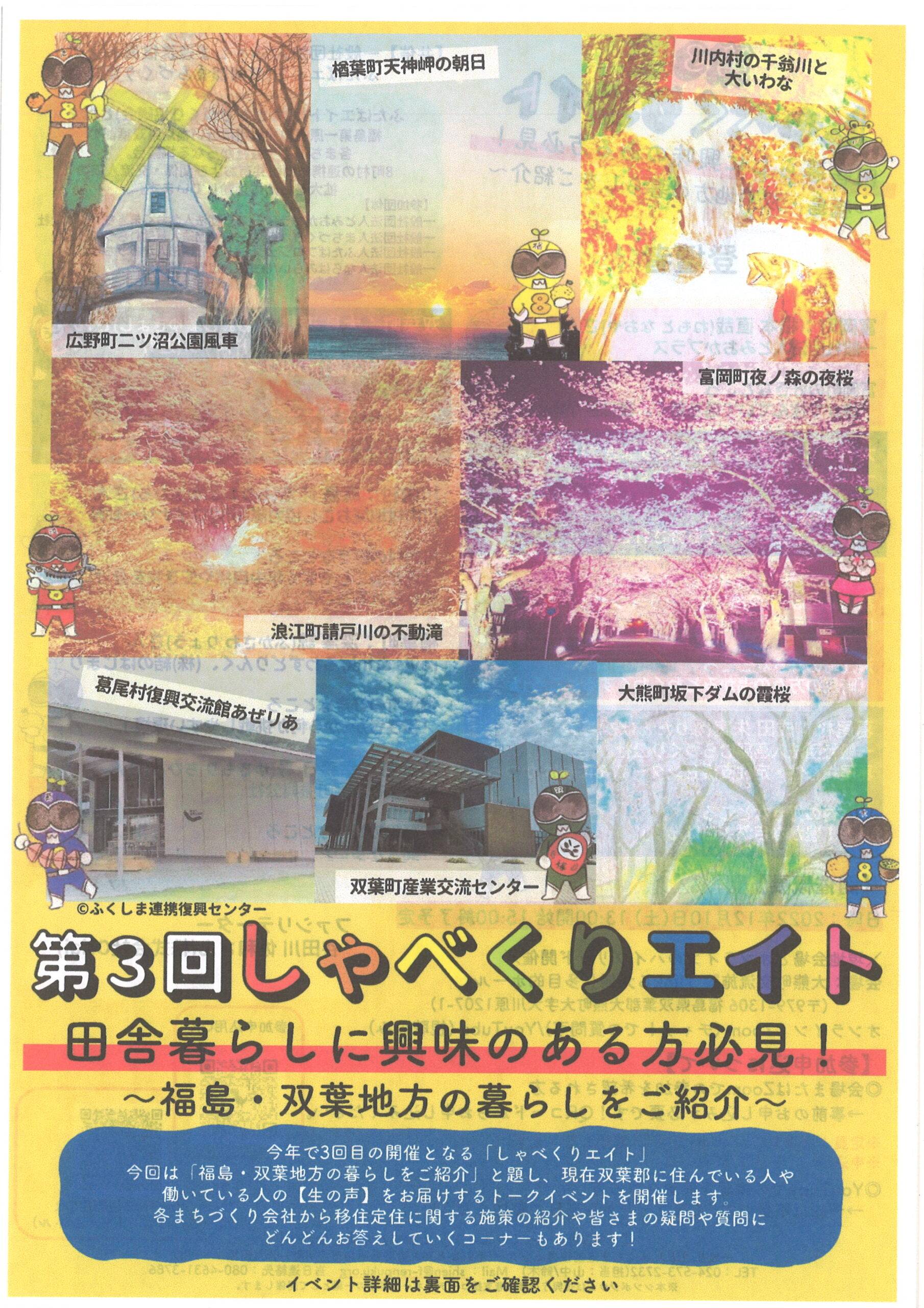 今年で3回目の開催となる「しゃべくりエイト」今回は「福島・双葉地方の暮らしをご紹介」と題し、現在双葉郡に住んでいる人や働いている人の【生の声】をお届けするトークイベントを開催します。